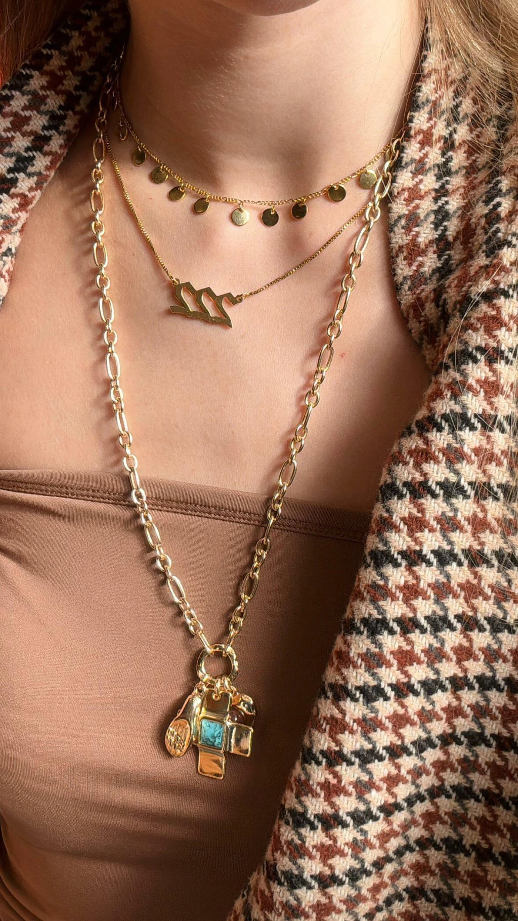 Sofisticação com personalidade. Este colar exclusivo da Splendore traz uma corrente robusta com banho em ouro 18K e três pingentes que combinam texturas, formas geométricas e cores marcantes.