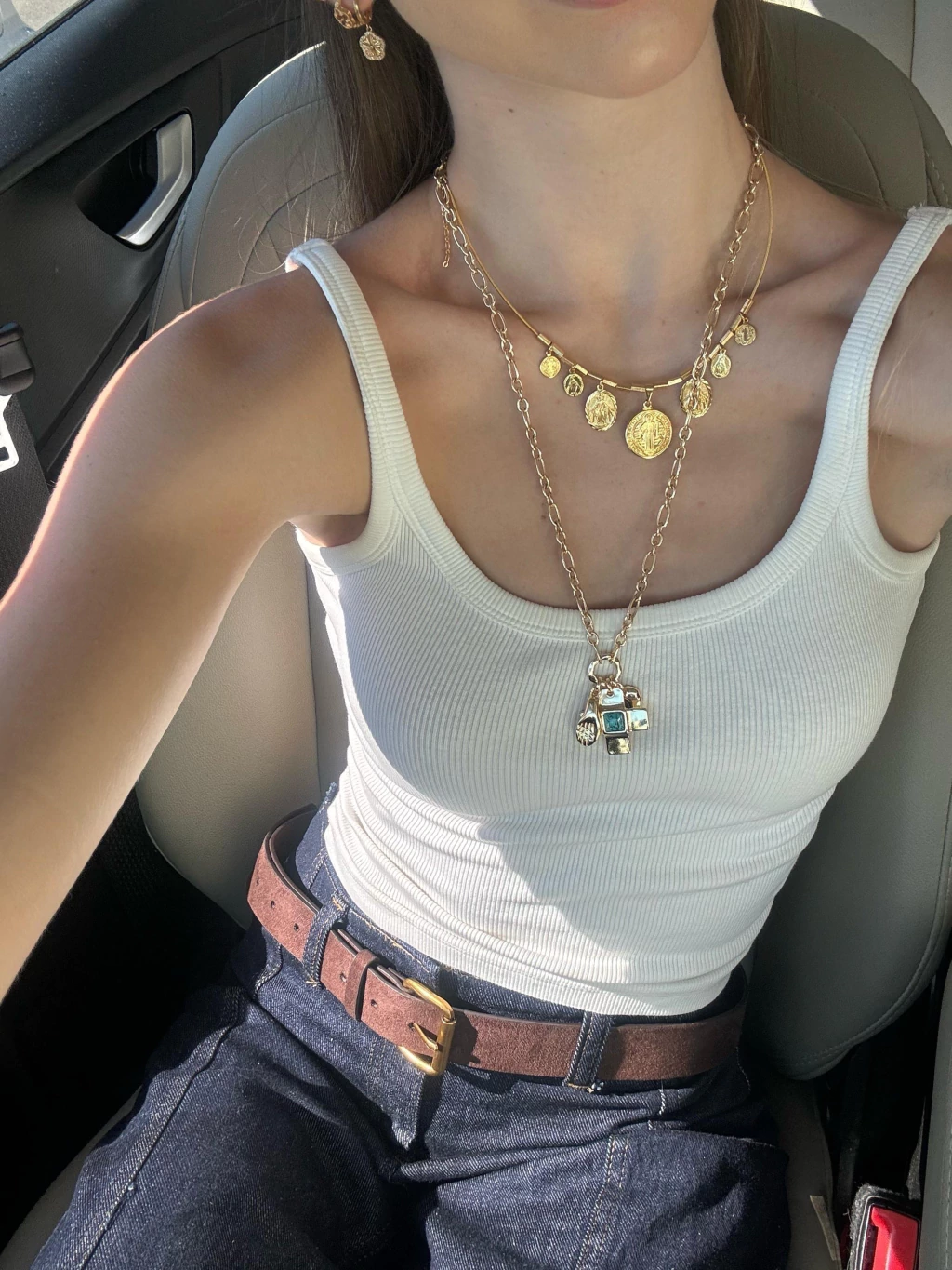 Colar com pingentes de medalhinhas, na corrente corda de violão com vários canutilhos separando as medalhinhas, no banho ouro 18k
