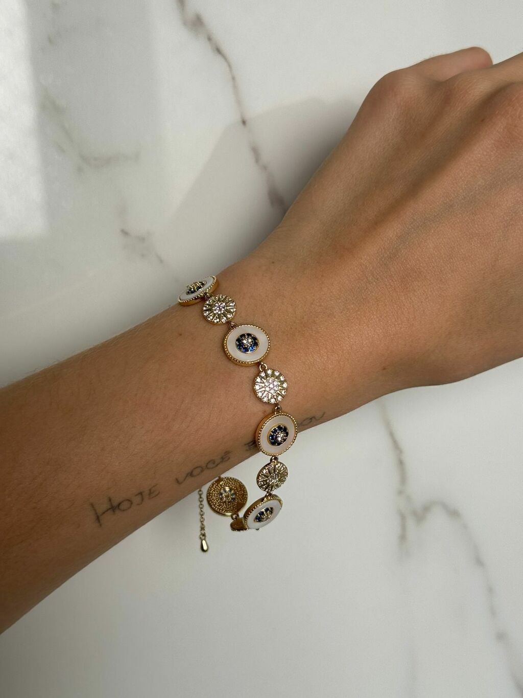Pulseira com olhos gregos de madrepérola cravejado com zircônias cristais banho ouro 18K
